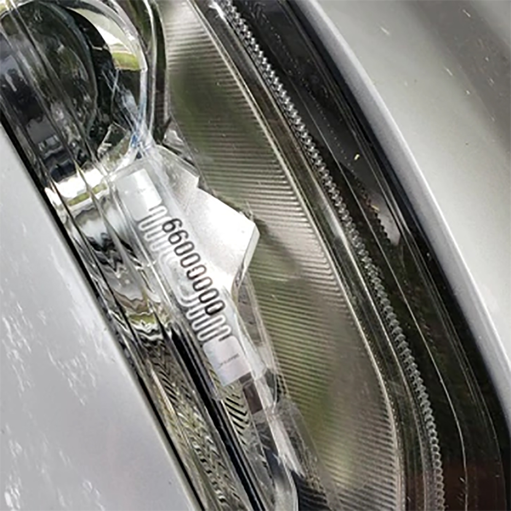 Self adhesive Tag designed for permanent headlight mounting on cars with metalized windshield. Can