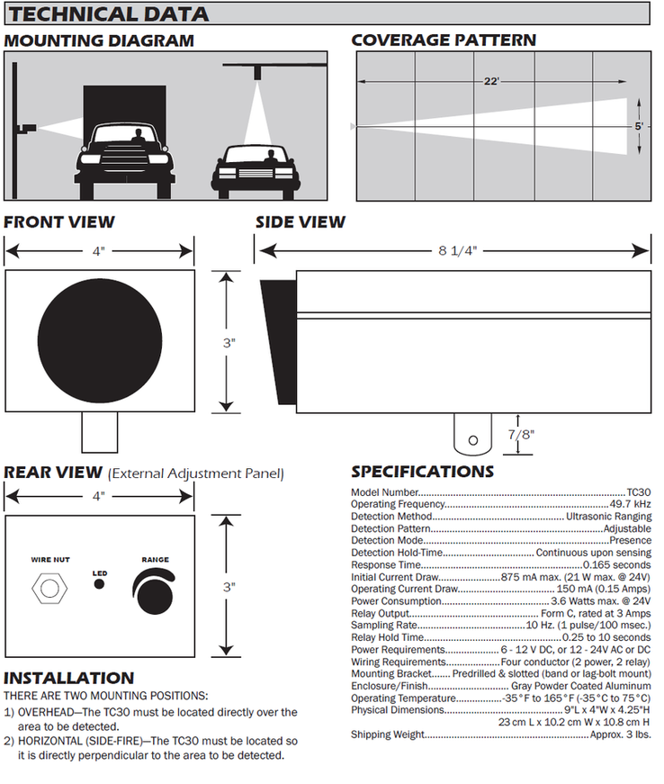pattern, stationary or in motion. The TC30 is ideal for detecting vehicle presence in a right hand